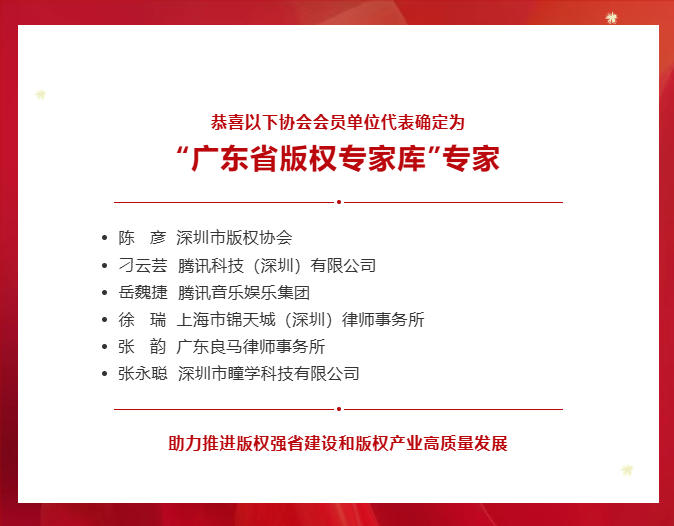 近日,广东省版权局正式公布了广东省版权专家库名单,我会常务副会长陈彦以及5位会员单位代表(见名单)成功入库广东省版权专家库省内专家。
