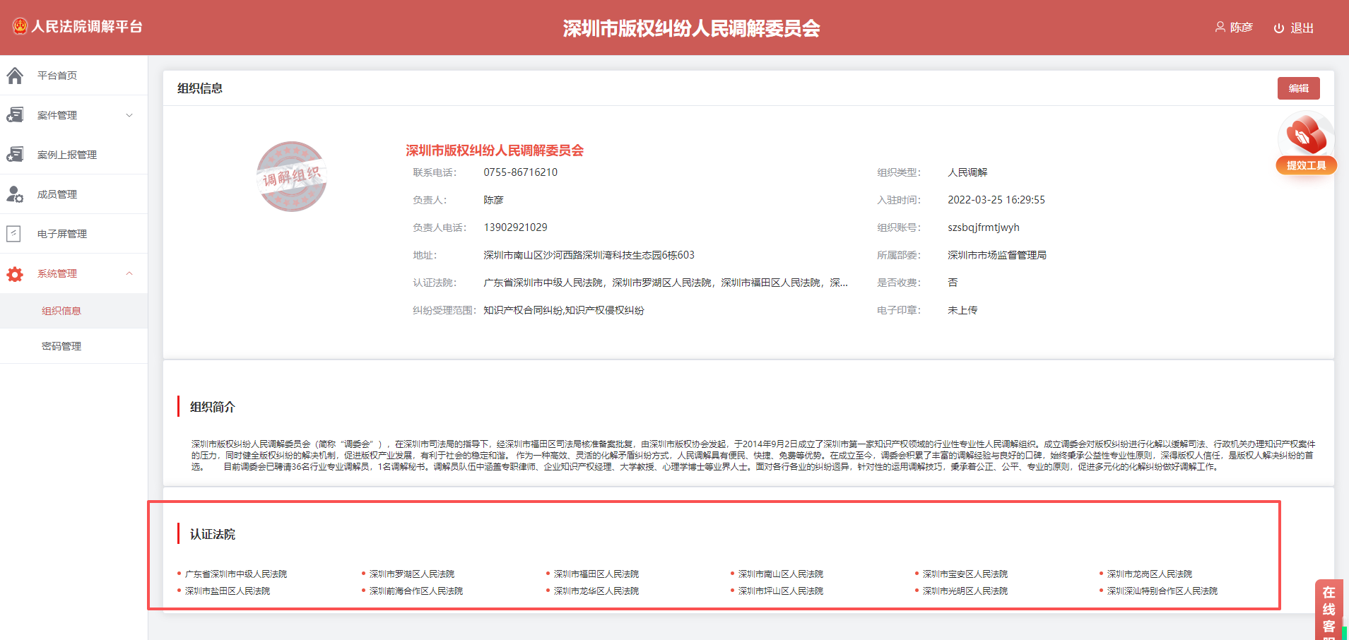 2、目前,版权协会与福田、罗湖、宝安、龙华、南山区法院签订了知识产权纠纷多元调解合作框架协议,参与法院知识产权庭的诉前调解工作,同时也是中国(深圳)知识产权保护中心、南山监管局、盐田监管局、宝安监管局等行政执法部门的特邀调解组织。